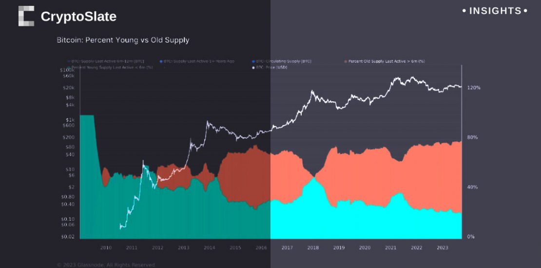 On the other hand, the remaining 20% of the supply has been transacted within the last six months, reflecting the actions of more short-term, possibly speculative, traders. This division, visualized through contrasting colors, illustrates the differing strategies within the Bitcoin market and the balance between patience and swift action.