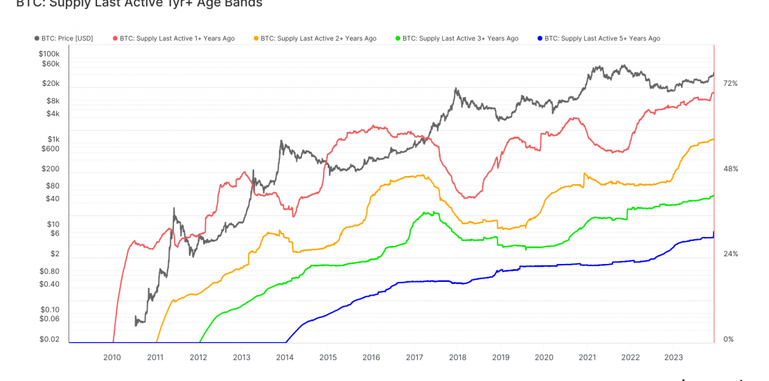 Historical data indicates a growing trend among Bitcoin investors towards long-term holding. Since Bitcoin’s inception on Jan. 3, 2009, coins have continuously circulated through mining, purchasing, and selling processes, with some being lost. However, an analysis of the supply last active reveals a significant percentage of Bitcoin has not moved on-chain for extended periods.