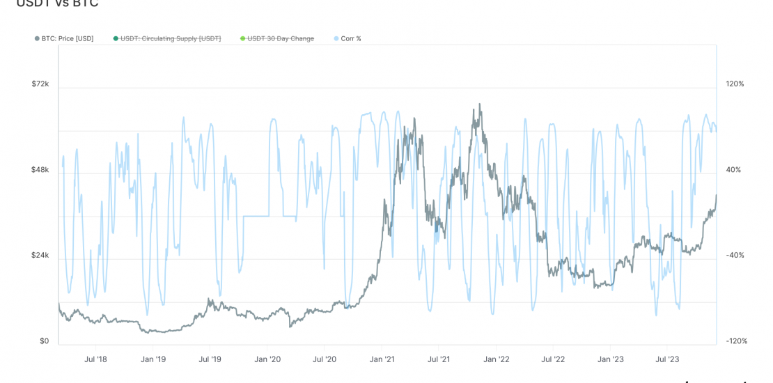 Historical data analysis unveils a noteworthy correlation between USDT Tether’s circulating supply and Bitcoin’s price movement. In November, a 96% correlation was observed, marking one of the highest correlation levels this year. However, correlation is not a constant factor and can significantly fluctuate over time, even turning negative in some instances.