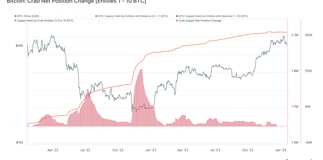 Specifically, holders identified as ‘crabs,’ known to possess 1-10 BTC, have maintained a flat to negative growth in their Bitcoin portfolios. Currently, this cohort holds approximately 2.1 million BTC, showing no substantial increase since December’s end.